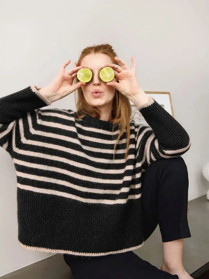 Wzór z włóczką do robienia na drutach Abby Sweater Sandnes Garn to oversizowy sweter w paski. Wydziergasz go z włóczki kaszmirowej Cashmere Sandnes Garn.