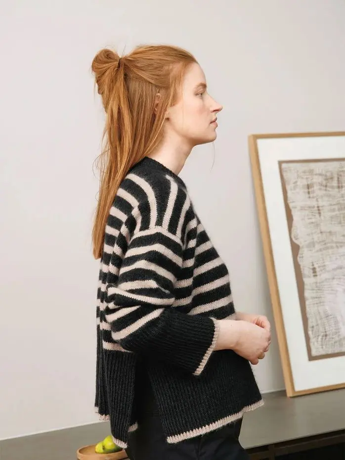 Wzór z włóczką do robienia na drutach Abby Sweater Sandnes Garn to oversizowy sweter w paski. Wydziergasz go z włóczki merino Sunday połączonej z włóczką moherową Tynn Silk Mohair marki Sandnes Garn.