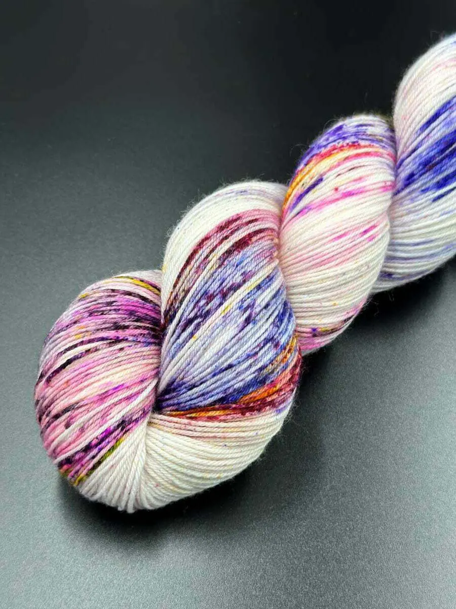 To przyjemna w odbiorze włóczka z wełny merynosów z dodatkiem nylonu w autorskim farbowaniu Berry Cocktail Sock 100 od Woollala. Absolutnie jagodowy koktajl, który odnajdziemy fioletowo – różowych przetarciach na jasnej, śmietankowej bazie