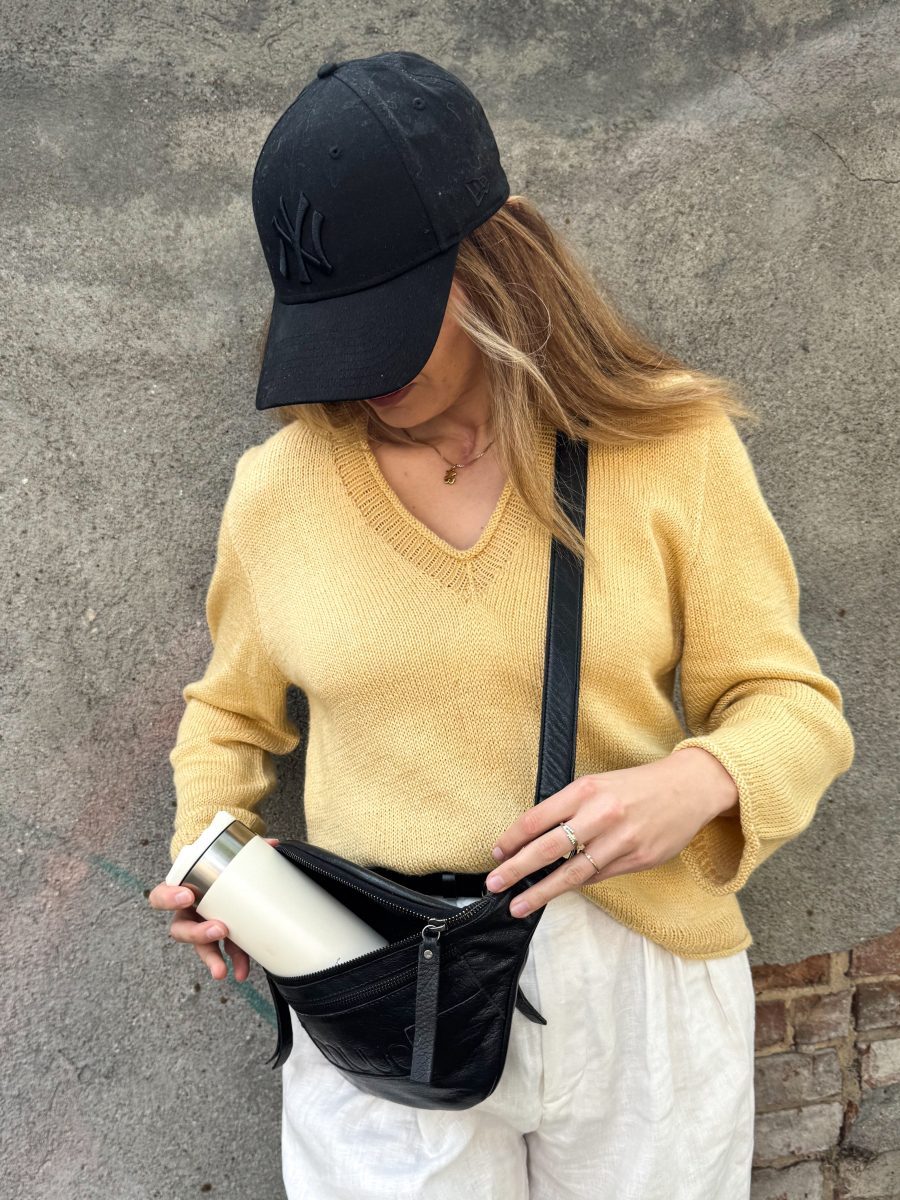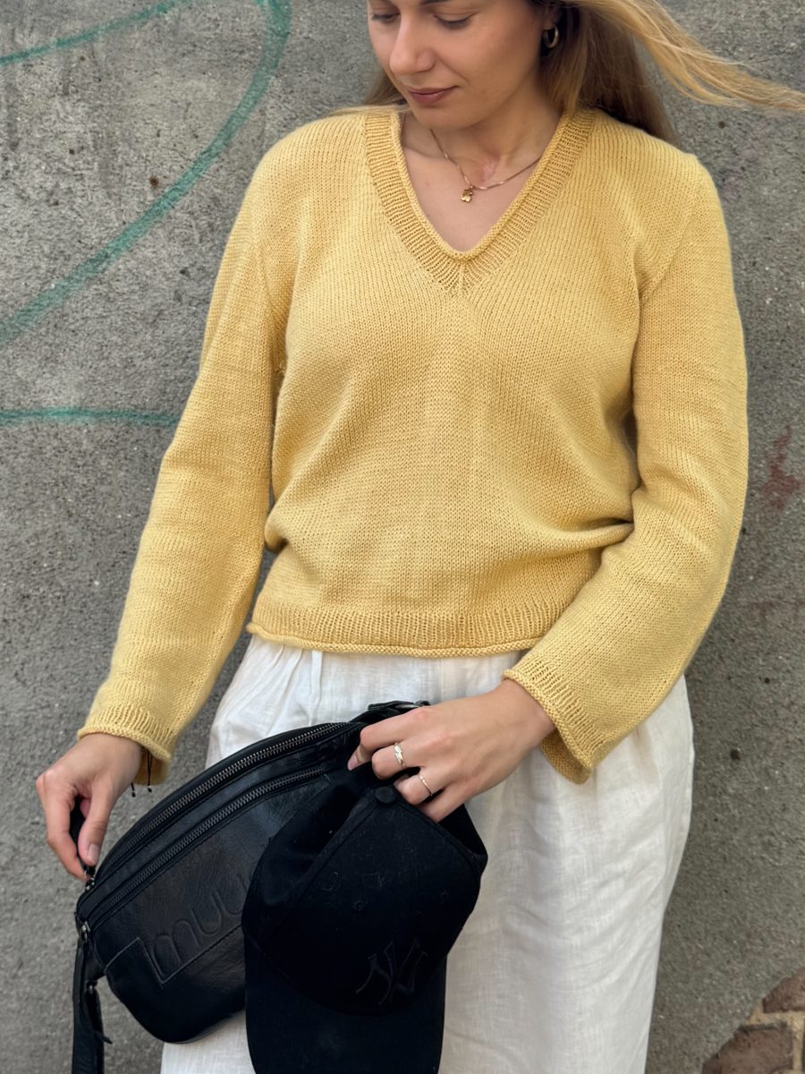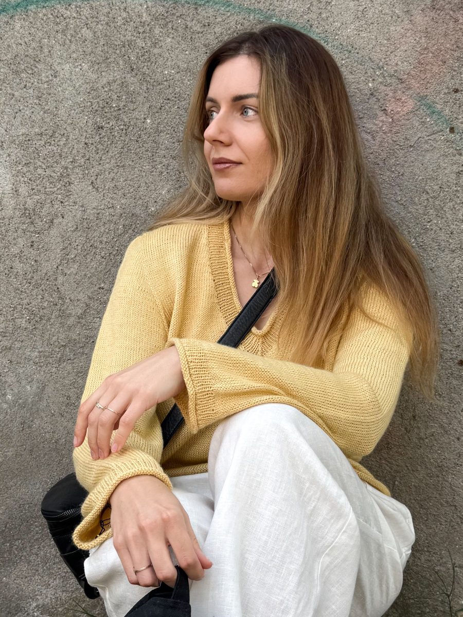 Butter Blouse to elegancki, a także lekki sweter z dekoltem V. Wydziergasz go od góry do dołu ściegiem dżersejowym. Dzierganie rozpoczyna się od wykonania tyłu oraz formowania ramion. Następnie, podbierając oczka wzdłuż ukośnych boków tyłu, nadajemy dzianinie kształt doskonale dopasowujący się do sylwetki. Kolejny etap to połączenie ramion z tyłem i uformowanie rękawów. Korpus dziergamy w okrążeniach, co zapewnia gładkie wykończenie bez szwów. Dekolt, dół swetra oraz rękawy wykańczamy ściągaczami z delikatnym wywinięciem. Długość rękawów można dopasować do własnych preferencji – wzór zawiera instrukcję dla trzech wariantów: krótki rękaw, rękaw 3/4 (za łokieć), a także długi rękaw. Butter Blouse to doskonały wybór na lekki sweter na drutach do noszenia przez cały rok.
