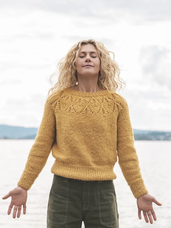 Od czasu do czasu Sandnes Garn współpracuje ze znanymi osobistościami przy tworzeniu kolekcji dzianin. Także tym razem zaprosił do kooperacji norweską podróżniczkę Cecilie Skog. W efekcie powstał sweter nr#1, z okrągłym karczkiem na którym wpleciono delikatny, ażurowy wzór.