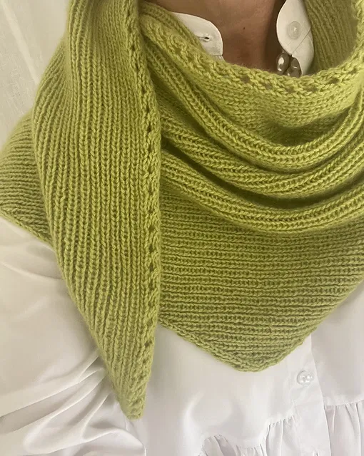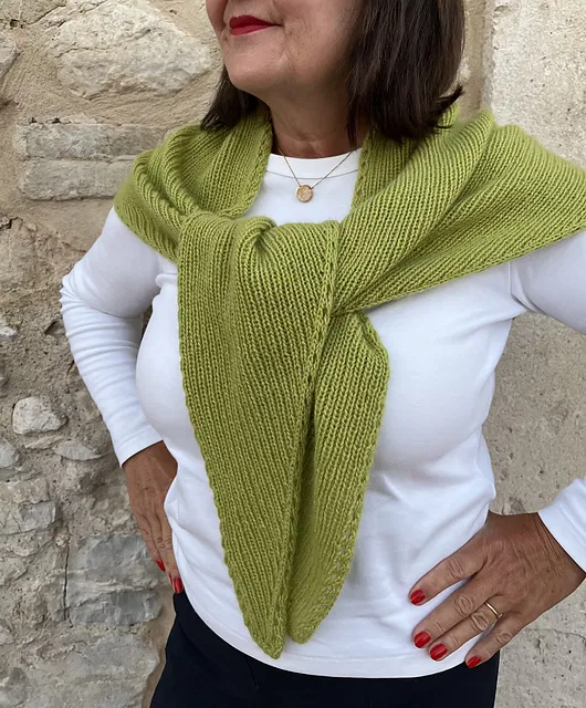 Wzór zawiera opis 3 rozmiarów chusty w kształcie trójkąta: rozmiar S, który możesz zawiązać wokół szyi (jeden raz), rozmiar M, który możesz owinąć wokół szyi, a także rozmiar L, który daje większą swobodę noszenia. Możesz okryć nim swoje ramiona, szyję, a także głowę. Wzór napisano w taki sposób, aby jak najlepiej wykorzystać włóczkę. Całość dzierga się prążkowanym ściegiem, który subtelnie wydobywa piękno włóczki. Szal zdobi także delikatny ażur wzdłuż krawędzi.