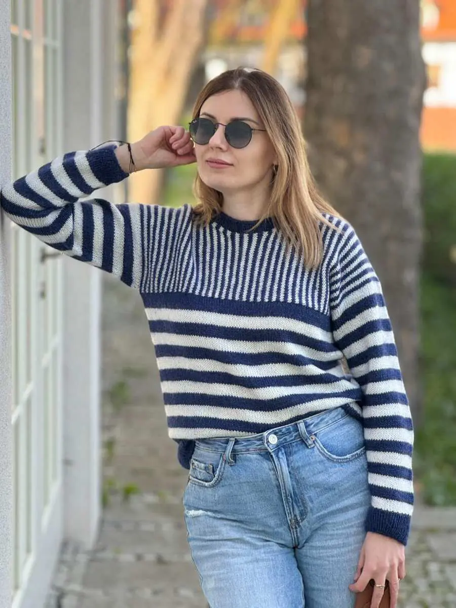 Każdy etap dziergania swetra Concordia to nie tylko przyjemność, lecz także różnorodność zastosowanych technik dziewiarskich. Górę swetra należy dziergać od prawego do lewego ramienia. W ten sposób paski na ramionach układają się pionowo. Następnie korpus swetra należy przerabiać od góry do dołu – dzięki takiej technice dziergania paski w korpusie ułożą się w poziomie, dodatkowo będą szersze, co stworzy ciekawy efekt wizualny. Sweter charakteryzuje dekolt w kształcie łódki oraz nisko wszywane, przerabiane w okrążeniach rękawy. Całość wykańcza się ściągaczami 1×1, ponadto oczka brzegowe przerabia się tak jak schodzą z drutu.