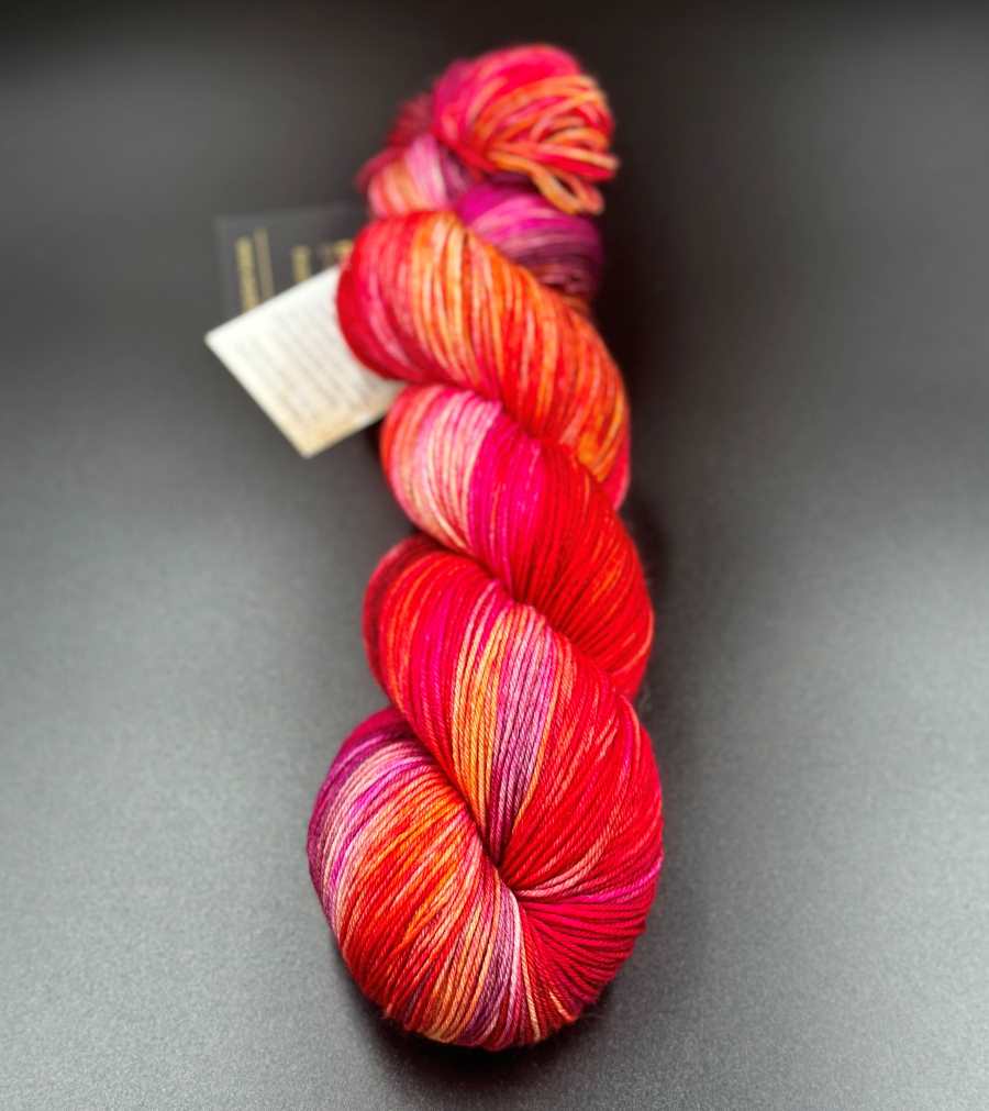 To przyjemna w odbiorze włóczka z wełny merynosów z dodatkiem nylonu w autorskim farbowaniu Davdas Sock 100 od Woollala. Całość utrzymana w energetycznych barwach orientu. Dominuje kolor czerwony z domieszką pomarańczowego, różu i bakłażanu.