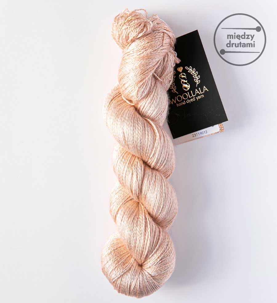 To przyjemna w odbiorze włóczka w 100% z jedwabiu morwowego w autorskim farbowaniu Desert Sand Beige Pure Silk Lace 600 od Woollala. Wielowymiarowy kolor bardzo jasnej brzoskwini, inspirowany ciepłym piaskiem pustyni, farbowanie jednokolorowe, bez przetarć i kropkowań.