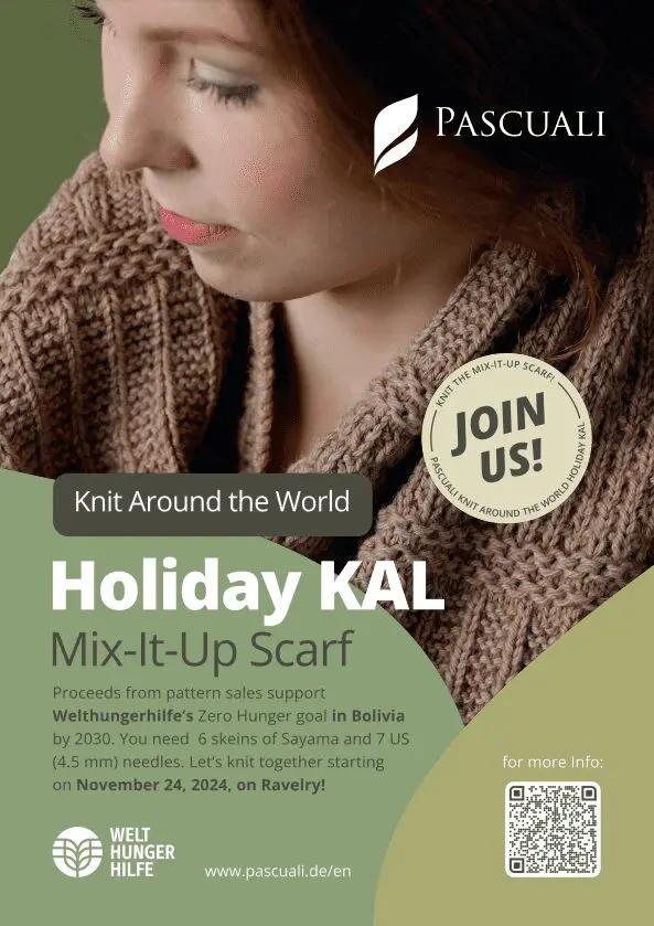 Pascuali zaprasza wszystkie dziewiarki, a także dziewiarzy na całym świecie do wspólnego dziergania w ramach Holiday Knit-Along (KAL) – stworzymy razem na drutach piękny szalik Mix-It-Up. Biorąc udział w KALu staniesz się częścią globalnej społeczności dziewiarskiej, samodzielnie wykonasz na drutach przepiękny szal z włóczki Sayama i dodatkowo WESPRZESZ SZCZYTNY CEL. Cały dochód ze sprzedaży wzoru zostanie przekazany na rzecz organizacji Welthungerhilfe.