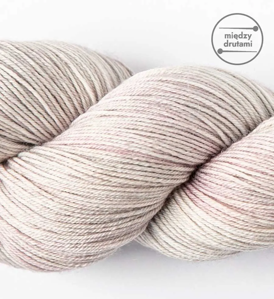 To przyjemna w odbiorze włóczka z wełny merynosów z dodatkiem nylonu w autorskim farbowaniu Elinor Sock 100 od Woollala. Wielowymiarowy kolor srebrzystego beżu, z bladoróżową nutą , farbowanie jednokolorowe, bez przetarć i kropkowań.