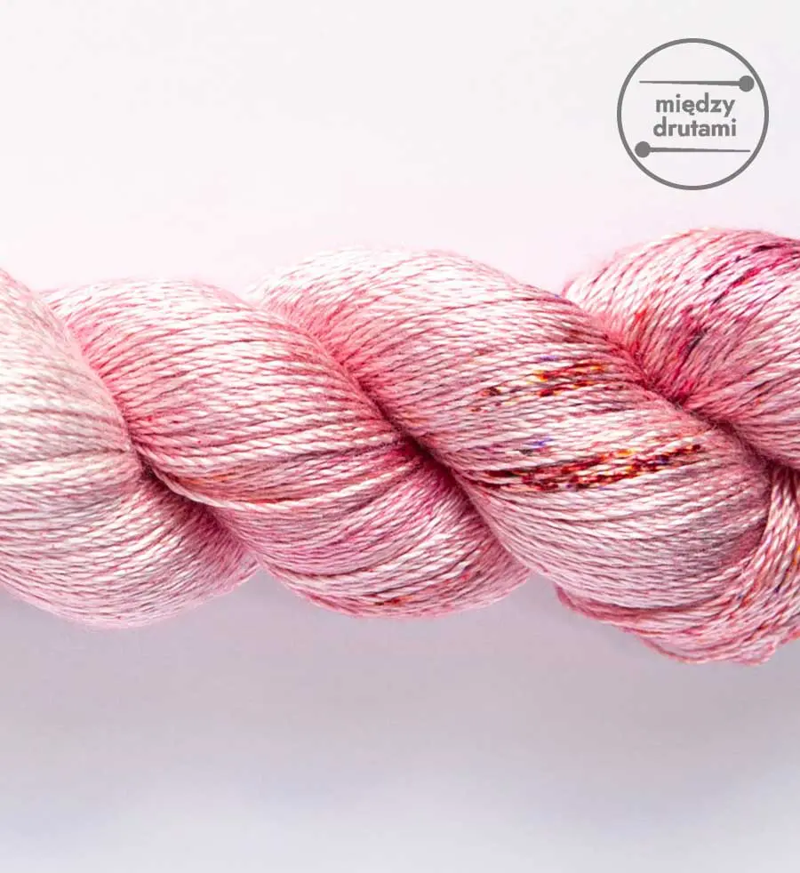 To przyjemna w odbiorze włóczka w 100% z jedwabiu morwowego w autorskim farbowaniu Emma Speckled to Dawn Pure Silk Lace 600 od Woollala. Wielowymiarowy kolor soczystego różu, widoczne kolorowe akcenty w postaci przetarć i kropkowań w kolorach ciemnego różu, pomarańczy, a nawet fioletu.