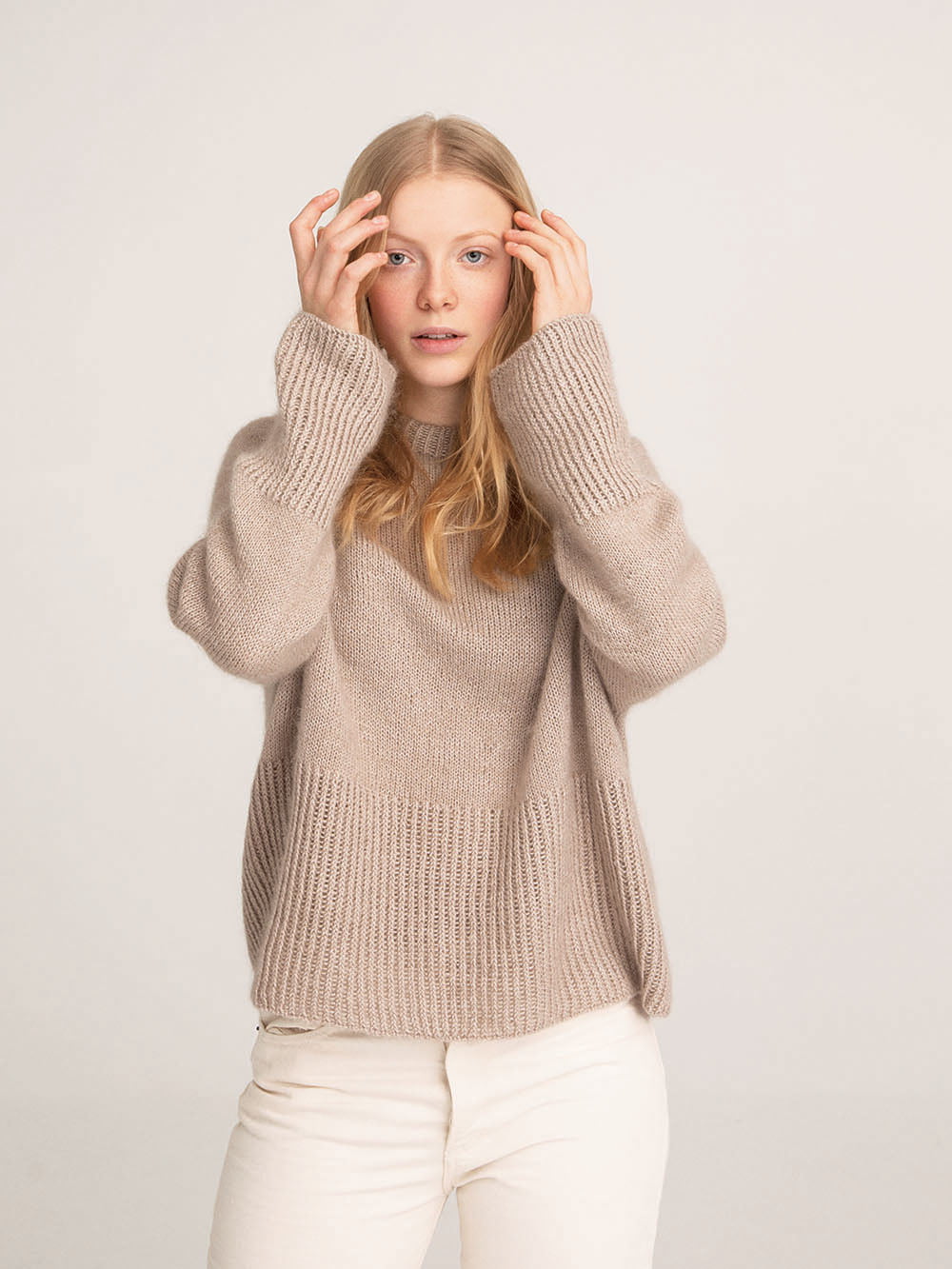Wzór rozpisany jest z udziałem włóczki moherowej Tynn Silk Mohair, dołączonej do bazowej włóczki wełnianej lub z alpaki.