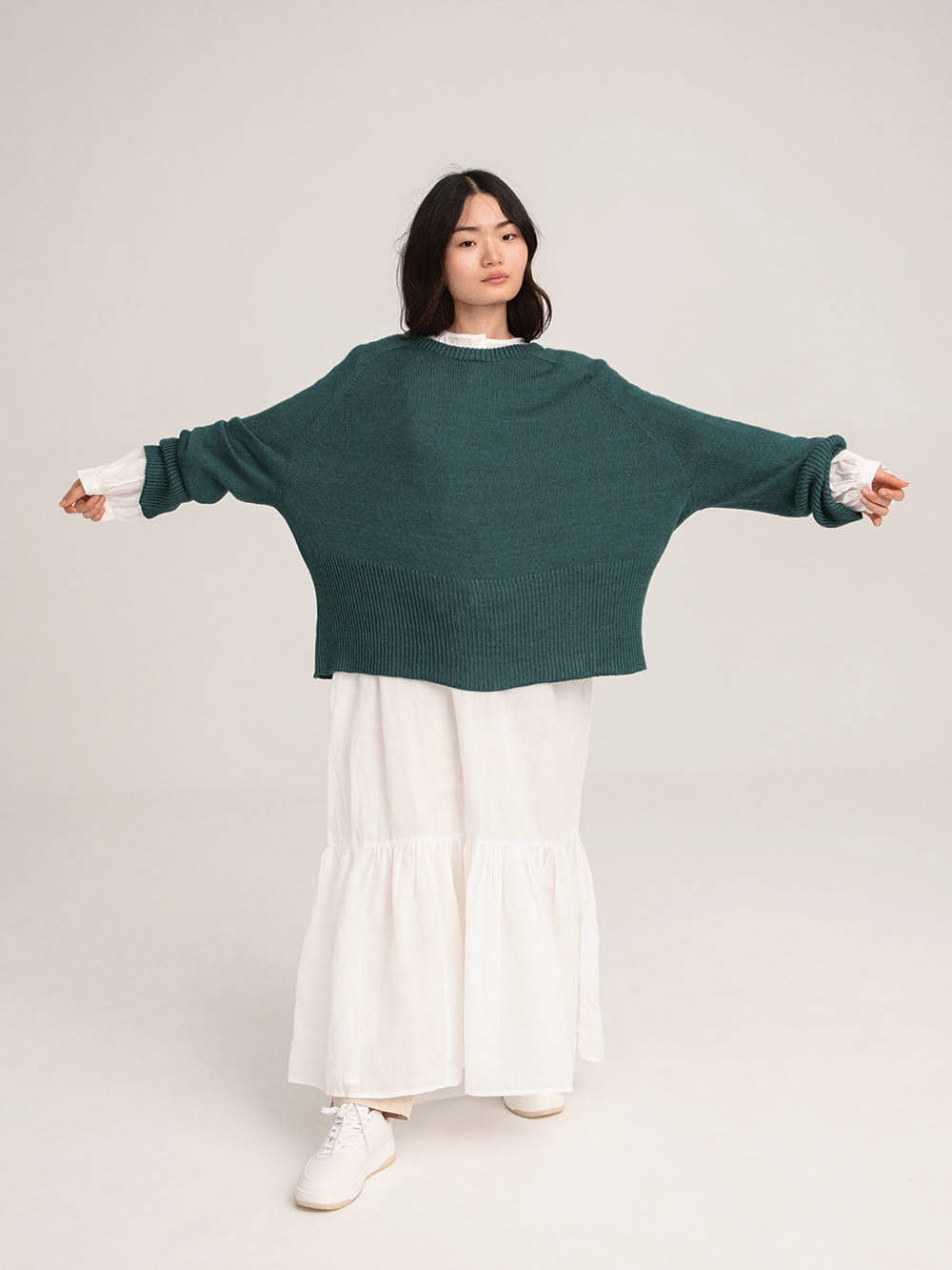 Sweter Franky to ponadczasowy klasyk, lekki oversize. Wysoko zarysowane linie ściągacza przełamują jego prostotę. To absolutny „must have” w każdej szafie.