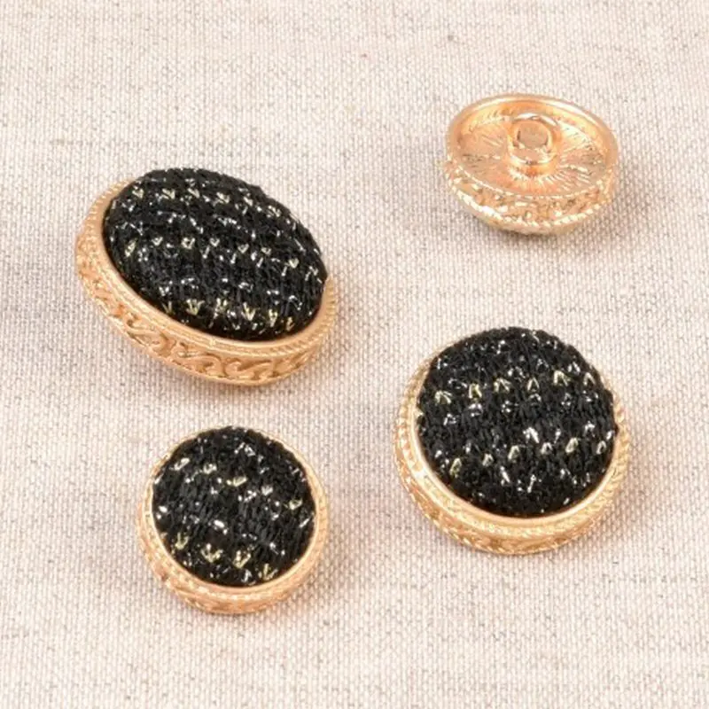 Guziki są wypukłe, w oprawie ze stopu metali w kolorze złota, na nóżce.