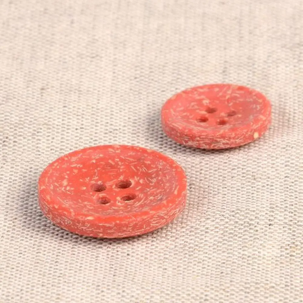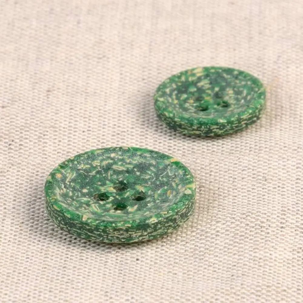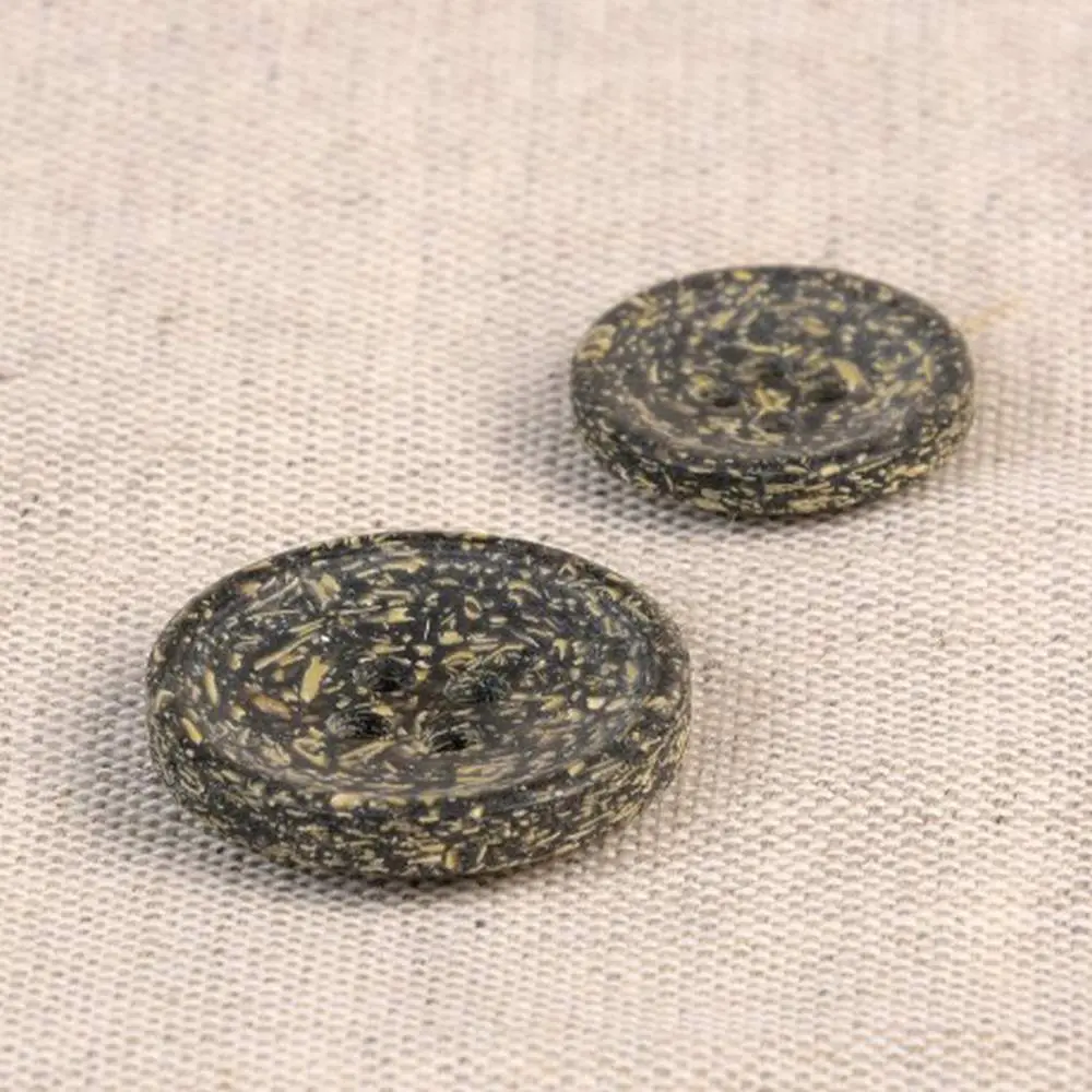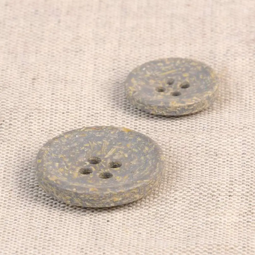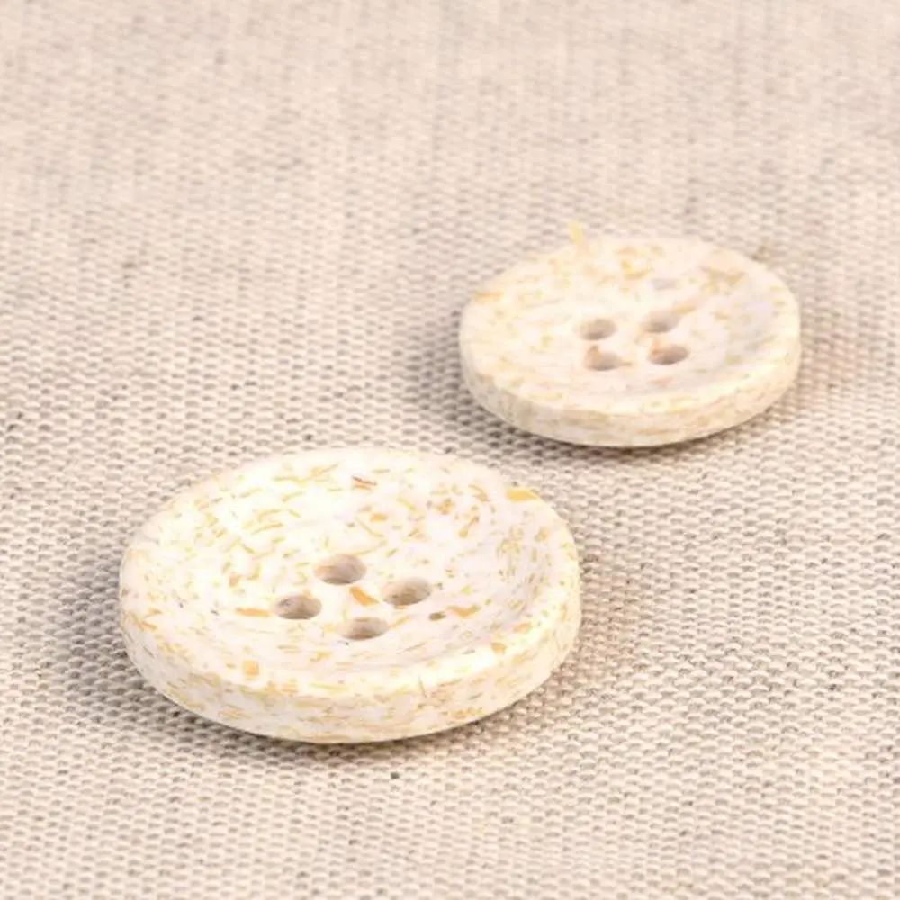 Guziki produkuje się z łuski ryżowej, która jest naturalnym odpadem po zbiorze ryżu. Następnie łuski ryżowe łączy się z poliestrem. Całość wygląda naprawdę niesamowicie! Guziki mają ciekawy, lekko ziarnisty wygląd, widoczne są drobinki ryżu. Dodatkowo pod palcami można wyczuć delikatną fakturę ziaren. Jaśniejsze ziarna tworzą na powierzchni guzika delikatny melanż kolorystyczny.