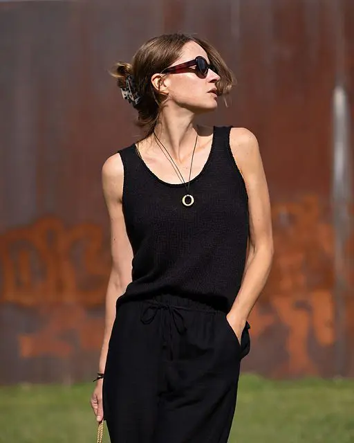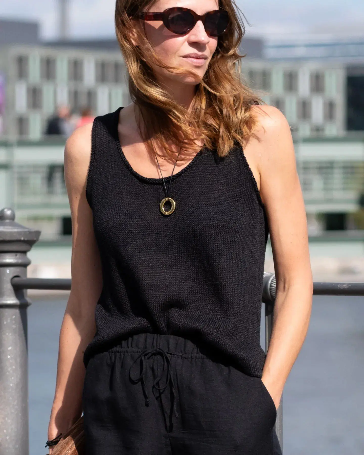 Gisele Top to lekki i przewiewny top na ramiączkach wykonany z letniej mieszanki lnu i bawełny. Prosty fason sprawia, że top ładnie i swobodnie się układa, dzięki czemu idealnie sprawdzi się w upalne dni. Świetnie wygląda również w połączeniu z lekką koszulą zarzuconą na ramiona, a także marynarką. Top wydziergasz od góry do dołu. Przód i tył wykonuje się do końca otworów na ręce na płasko – najpierw tył, a następnie od razu dołącza się przód. Tułów dziergany jest gładkim dżersejem w okrążeniach i kończony podwójnym ściągaczem. Na koniec nabiera się oczka z dekoltu i otworów na ręce i przerabia gładko, tak aby uzyskać zwijający się brzeg.