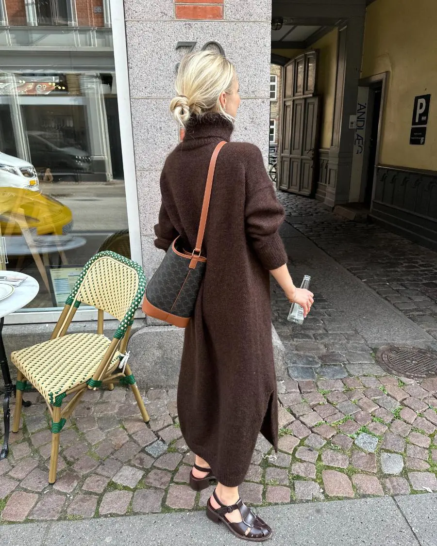 PetiteKnit Chestnut Dress to oryginalne wydanie PetiteKnit, na podstawie którego wykonać można ciepłą sukienkę z golfem. Projektantka sugeruje włóczkę Pelsuld 8/2 marki Hjelholts Uldspinderi trzymaną razem z nitką Brushed Lace marki Mohair by Canard. Włóczki nie są dostępne w ofercie Między Drutam. Zamiennie polecamy włóczkę Tynn Peer Gynt lub Sunday w połączeniu z dowolną włóczką moherową np. Tynn Silk Mohair, Silk Mohair lub cienką alpaką, np. Alpakka Folgetrad.