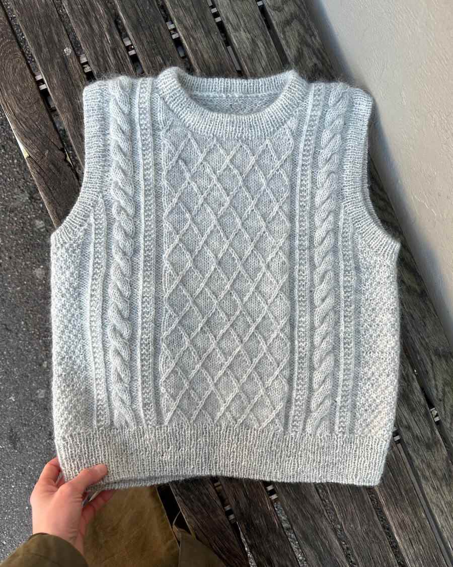 Wzór na ciepłą kamizelkę do robienia na drutach z włóczki Tynn Peer Gynt połączonej z włóczką moherową Tynn Silk Mohair od Sandnes