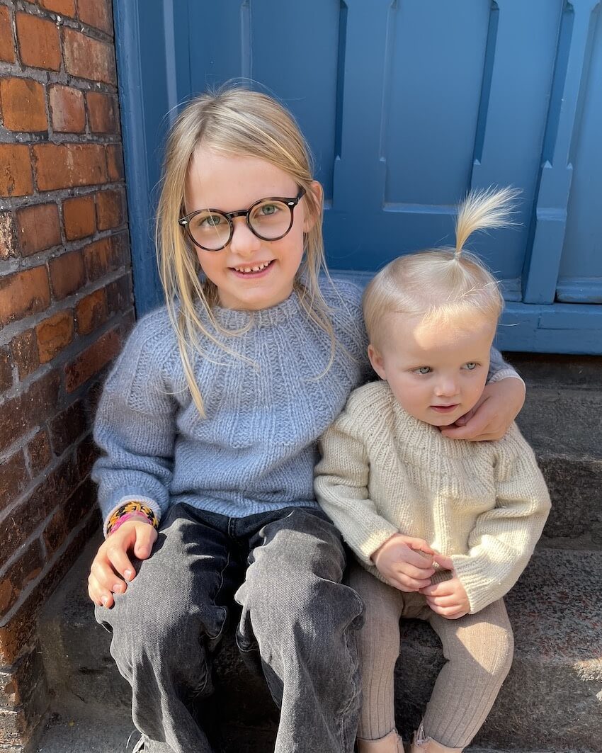 PetiteKnit Sunday Sweater Junior to oryginalne wydanie PetiteKnit, na podstawie którego wykonać można klasyczny, dziecięcy sweter z okrągłym karczkiem. Sweter powstaje z dwóch nitek włóczki KOS a także Tynn Silk Mohair Sandnes Garn.