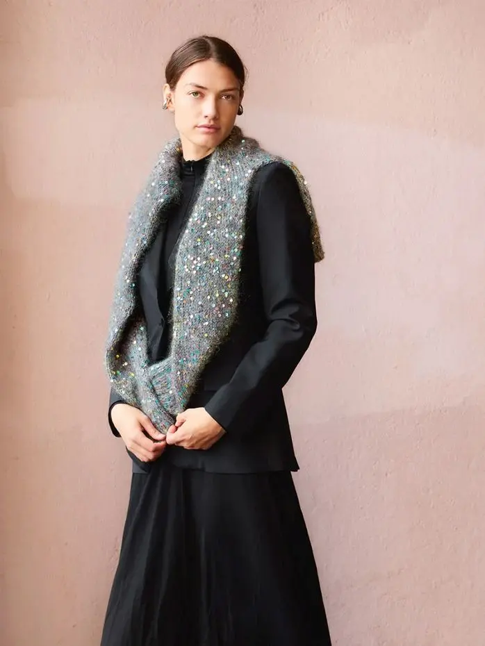 Wzór do robienia na drutach Rookie Sweater 25-06 Sandnes Garn to puszysty sweter-chmurka z błyszczącymi cekinami. Ten model wydziergasz z włóczki marki Sandnes Garn Ballerina Chunky połączonej z włóczką Paljett także marki Sandnes Garn. Jest to klasyczny, raglanowy sweter. To idealny sweter na drutach dla początkujących.