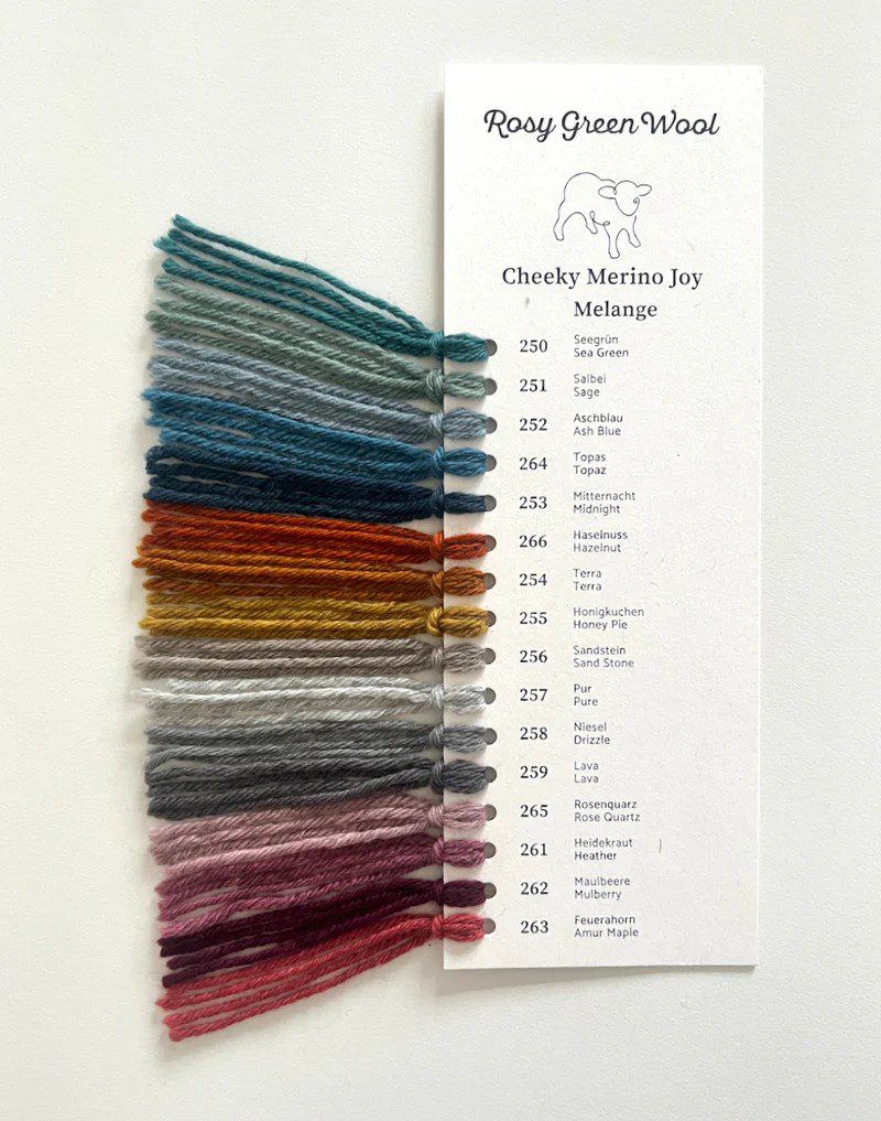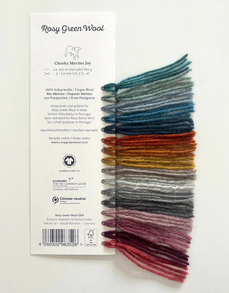 Karta-wzornik kolorów włóczki Rosy Green Wool: Cheeky Merino Joy, Lovely Merino Treat, Big Merino Hug
