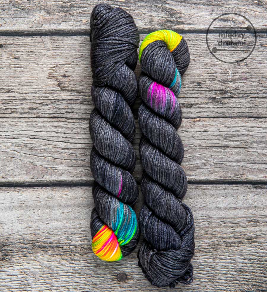 Short Rainbow Comfy DK to wyjątkowe farbowanie na jednolitej bazie w kolorze granatowym, a także antracytowym. Krótkie, neonowe i wyraziste przejścia kolorystyczne gwarantują wspaniałą zabawę podczas tworzenia dzianiny. Dzięki tej włóczce stworzysz unikalny i niepowtarzalny wzór na swoim swetrze lub chuście. Aby uzyskać efekt krótkich przejść kolorystycznych nasze włóczki zostały zafarbowane znaną w świecie barwiarskim techniką krótkiego gradientu.
