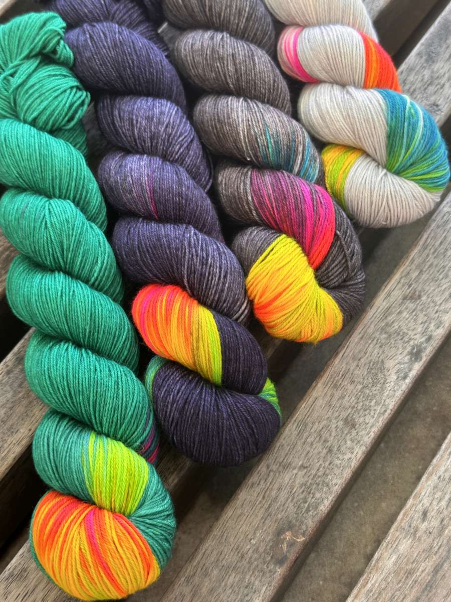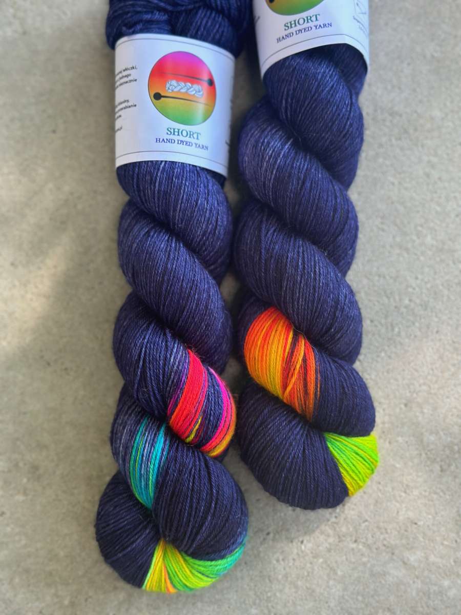 Short Rainbow Comfy Merino to wyjątkowe farbowanie na jednolitej bazie w kolorze granatowym, szmaragdowym, antracytowym, a także jasnym szarym. Krótkie, neonowe i wyraziste przejścia kolorystyczne gwarantują wspaniałą zabawę podczas tworzenia dzianiny. Dzięki tej włóczce stworzysz unikalny i niepowtarzalny wzór na swoim swetrze lub chuście. Aby uzyskać efekt krótkich przejść kolorystycznych nasze włóczki zostały zafarbowane znaną w świecie barwiarskim techniką krótkiego gradientu.
