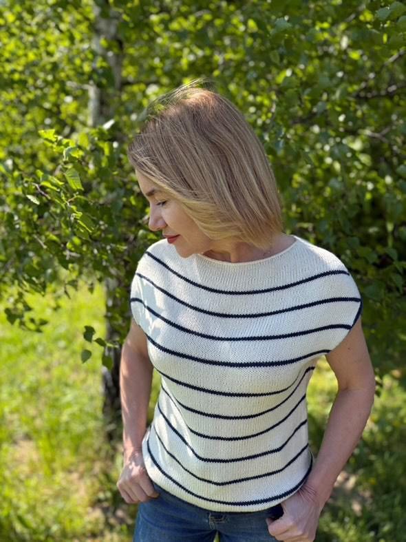 Striped Shirt to wzór na druty z włóczką, według którego wykonasz delikatną, lejącą i przewiewną bluzkę na wiosnę oraz lato w stylu marynarskim. Wzór autorstwa Tatiany Kawałko to efektowny oraz kobiecy projekt, który przyciąga wzrok. Bluzkę wykonasz z wegańskiej włóczki Cumbria w kolorze naturalnym marki Pascuali.