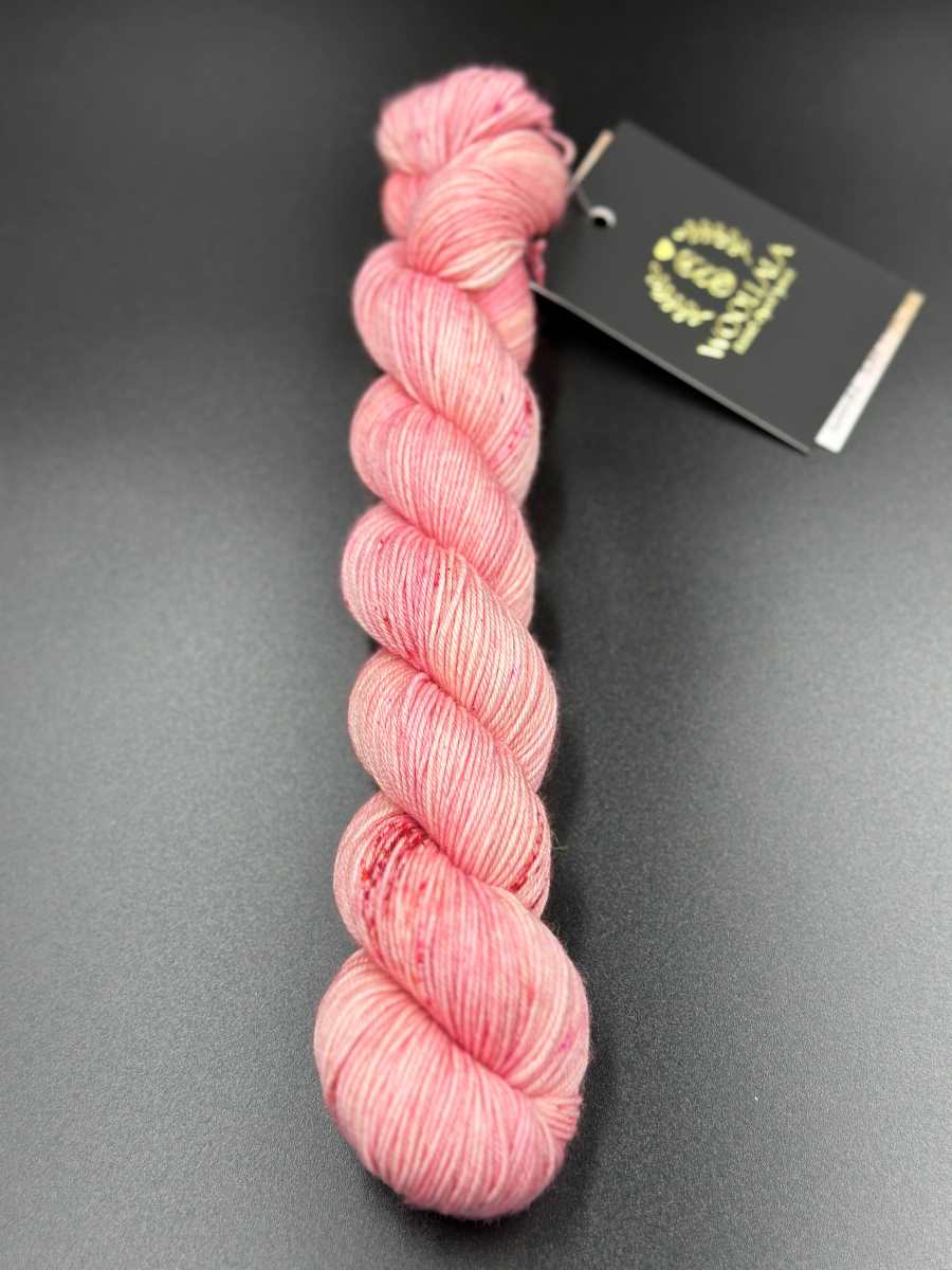 To przyjemna w odbiorze włóczka z wełny merynosów z dodatkiem nylonu w autorskim farbowaniu Summer Sun Pink Sock 50 od Woollala. Całość utrzymana w subtelnym odcieniu dość żywego różu, z mocniejszymi akcentami w postaci kropkowania.