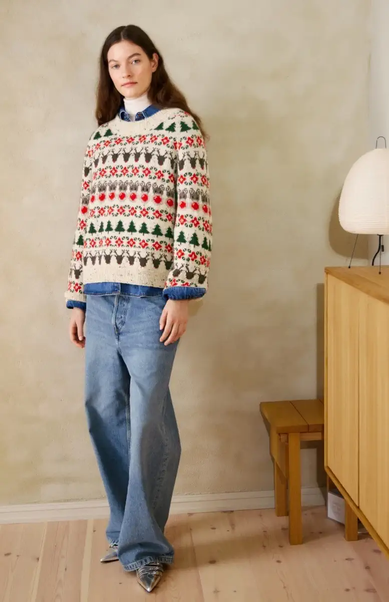 Świąteczny sweter 24-04 to wzór na druty według, którego wykonasz przepiękny sweter żakardowy z motywem świątecznym. Niezwykłe ornamenty, choinki oraz renifery z czerwonymi nosami powstają z włóczki Tynn Peer Gynt marki Sandnes Garn.