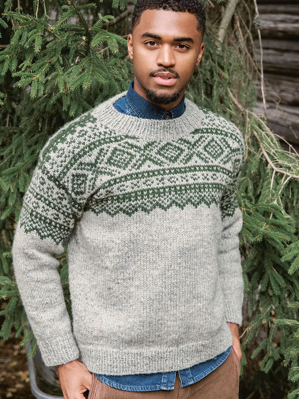 Sweter MARIUS robimy na drutach na okrągło, gdzie wzór żakardowy tworzymy na okrągłym karczku.