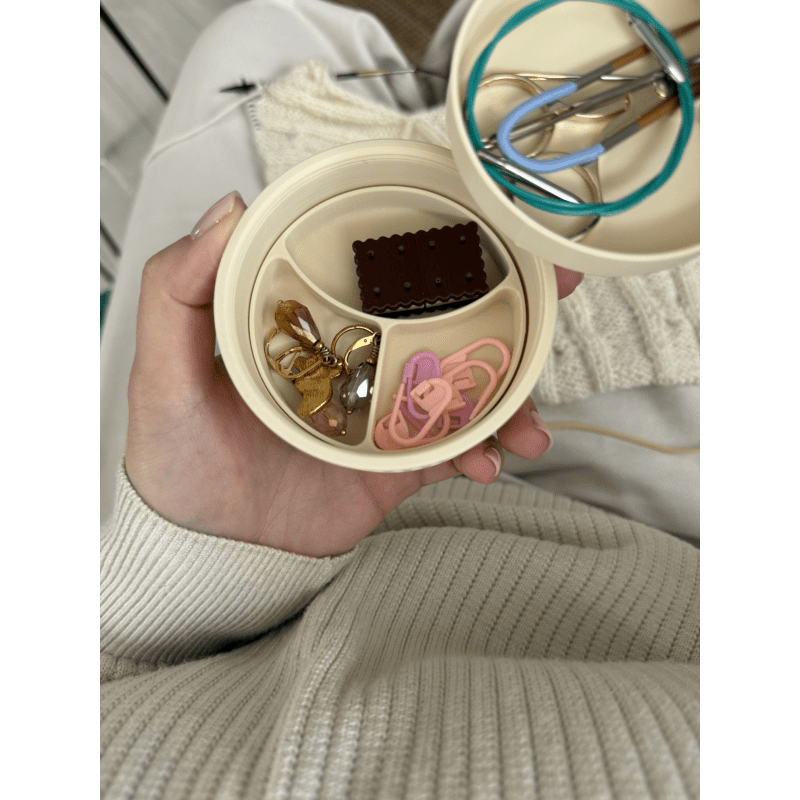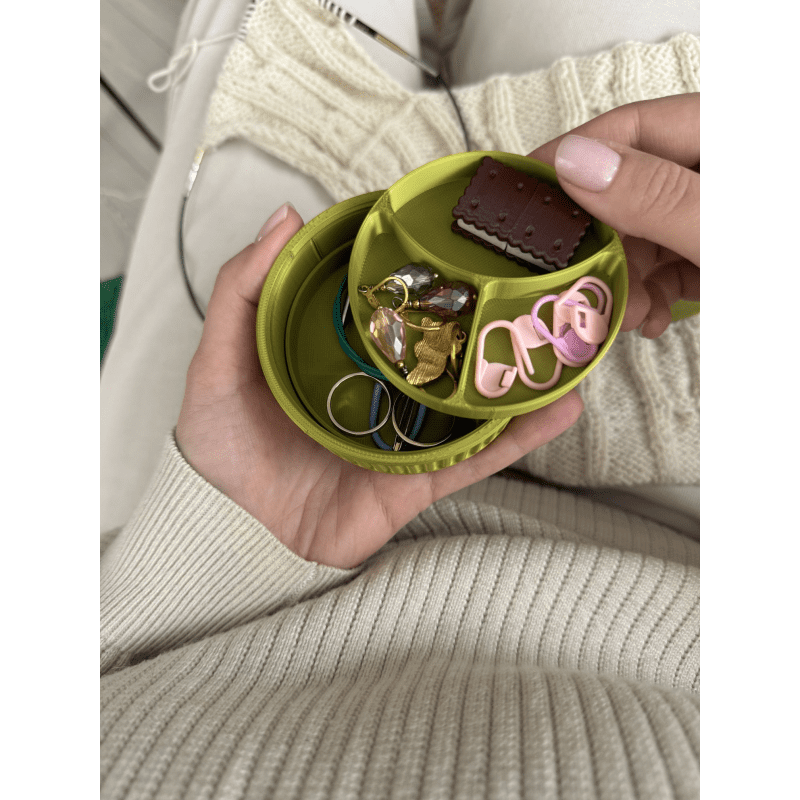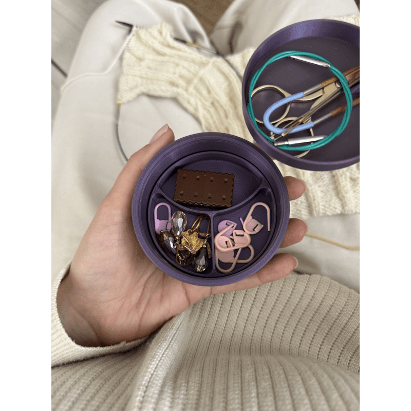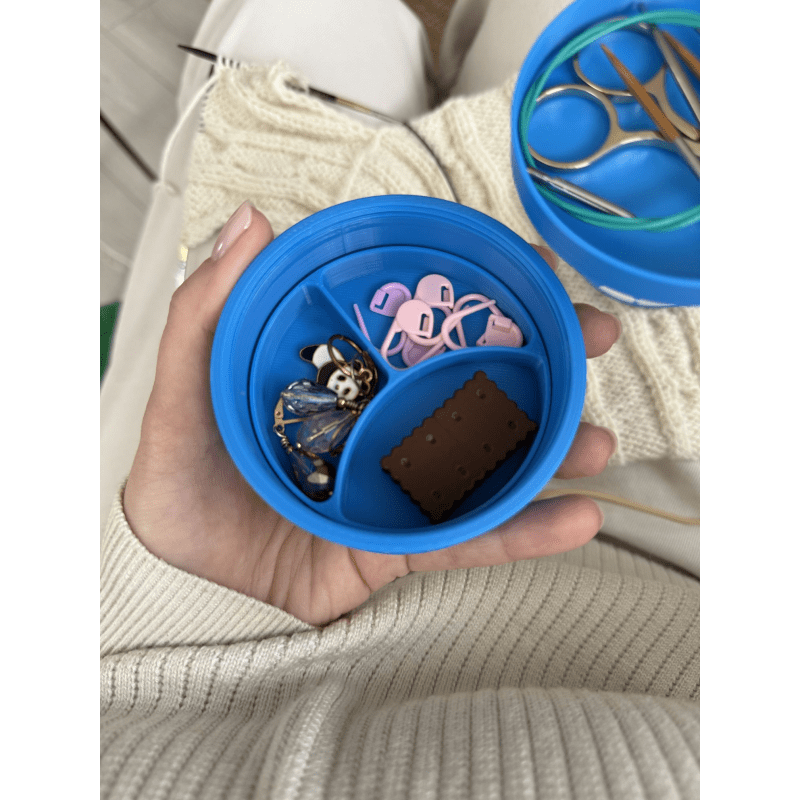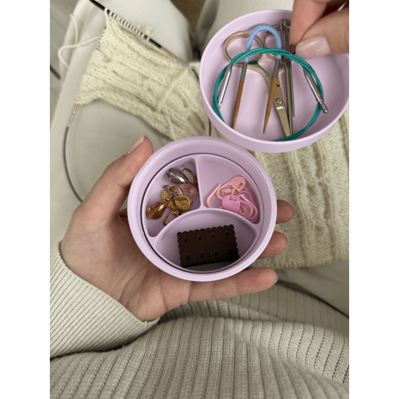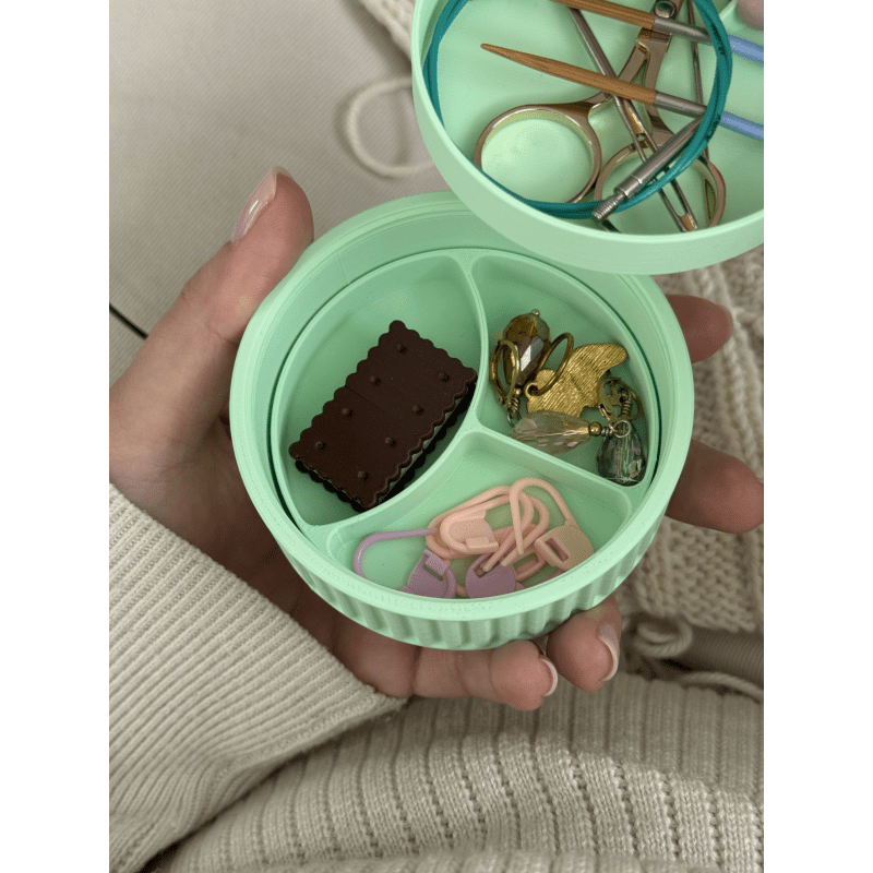 Macaron Mini Mini Knitting Stuff Organizer to pudełko na akcesoria dziewiarskie, które stworzono z myślą o rękodzielnikach, którzy cenią sobie porządek, funkcjonalność i estetykę. To pudełko bez separatorów – możesz dostosować jego wnętrze do własnych potrzeb, wybierając odpowiednie przegródki osobno. Odkręcane wieczko ułatwia transport i zabezpiecza przed przypadkowym otwarciem, nawet w torebce czy plecaku. Szach-mat Mini Został wykonany w technologii druku 3D, z biodegradowalnych materiałów pochodzących z odnawialnych źródeł. Pomieścisz w nim wszystkie niezbędne drobiazgi: nożyczki, znaczniki, guziki, igły, żyłki i zakrętki magnetyczne.