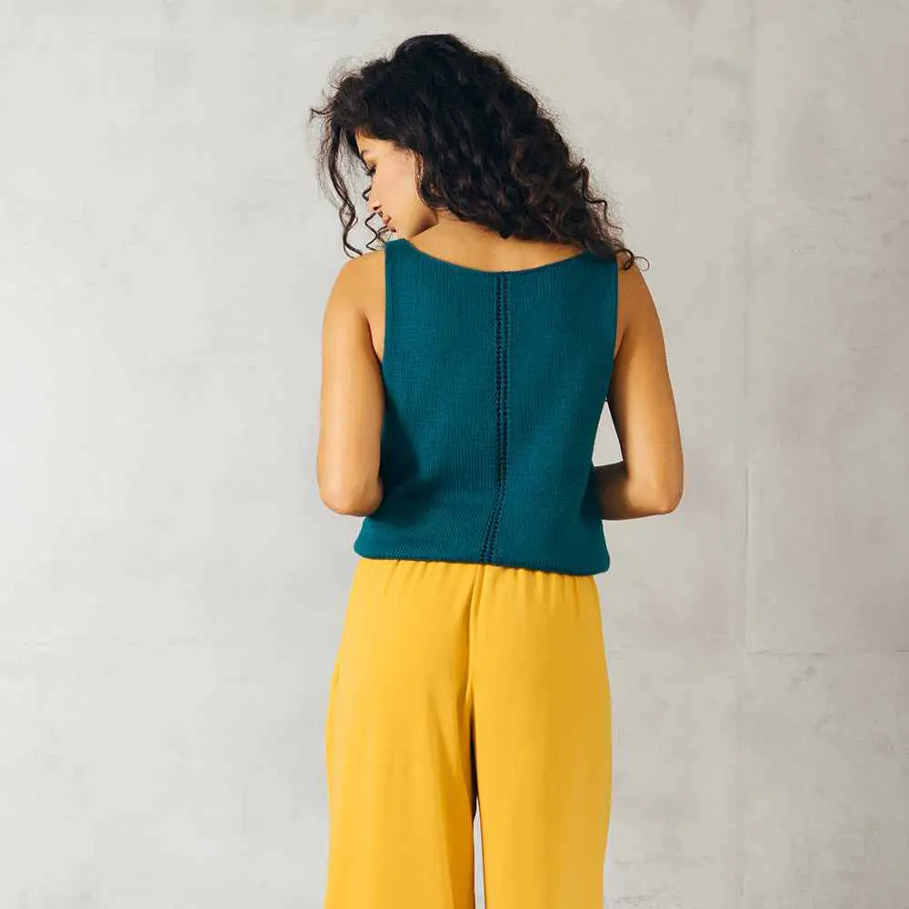 Top Reneta jest przerabiany na okrągło zaczynając od dołu do podkrojów pach, dalej przerabiać przód i tył oddzielnie w rzędach. Ozdobą topu jest ścieg ażurowy biegnący przez środek pleców.